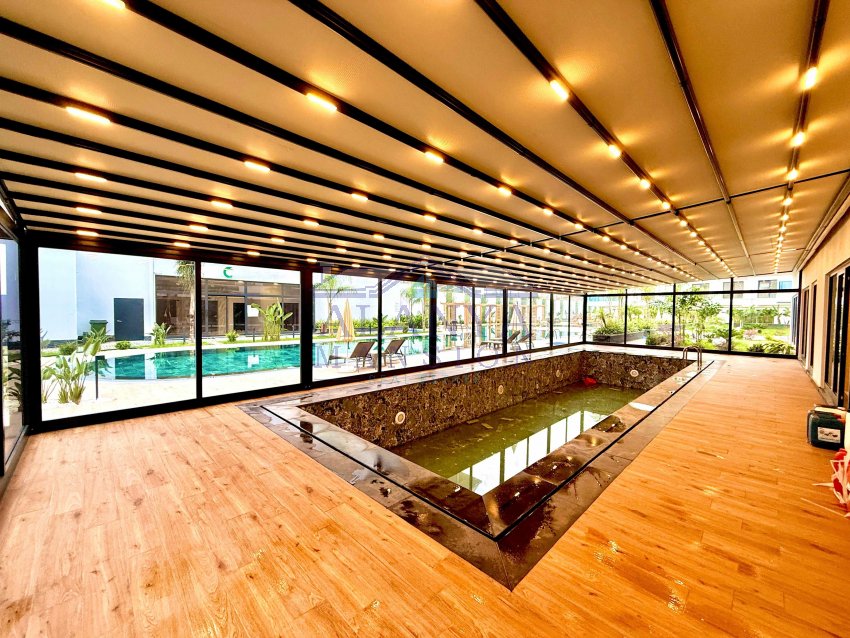 Инфраструктура комплекса: летний бассейн с зоной загара и отдыха, детский бассейн, крытый зимний бассейн, сауна, хамам, римская паровая комната, массажный кабинет, джакузи, фитнес-зал, кинотеатр, детская игровая комната, сад, беседки, детская игровая площадка, система видеонаблюдения, смотритель за комплексом.